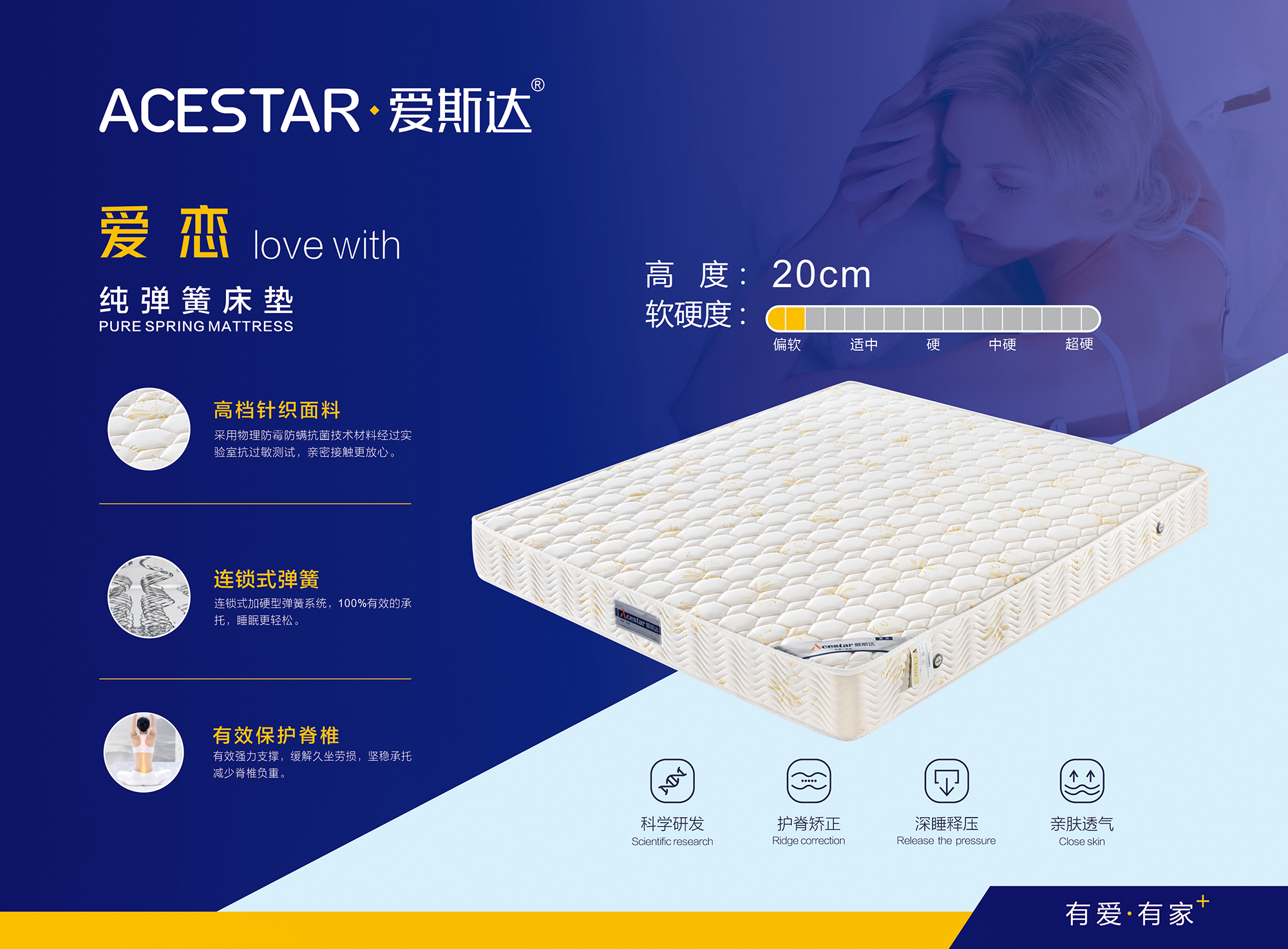 高档针织面料采用物理防霉防螨抗菌技术, 材料经过试验室抗过敏测试,亲密接触更放心独立研发了连锁式的弹簧系统,承压更好,100%有效的承托,睡眠更轻松高档针织面料采用物理防霉防螨抗菌技术,材料经过试验室抗过敏测试,亲密接触更放心, 独立研发了连锁式的弹簧系统。